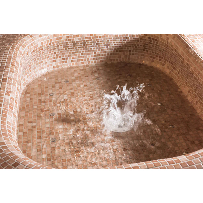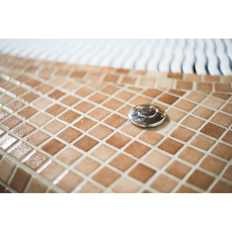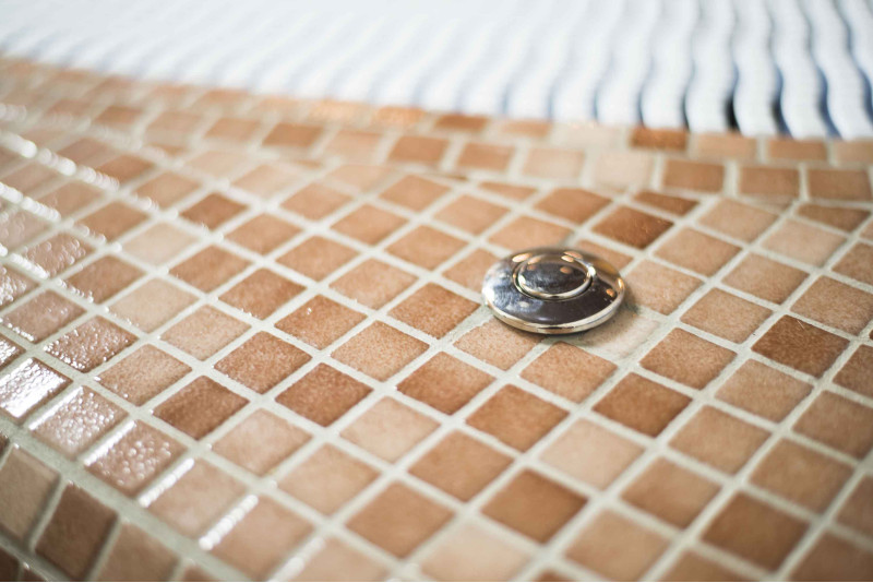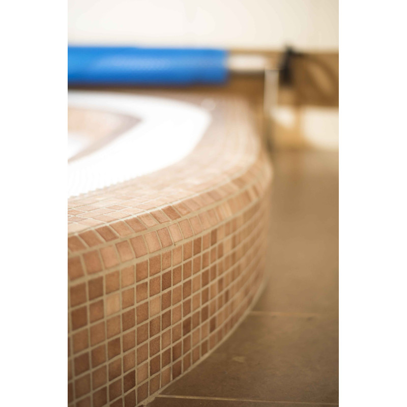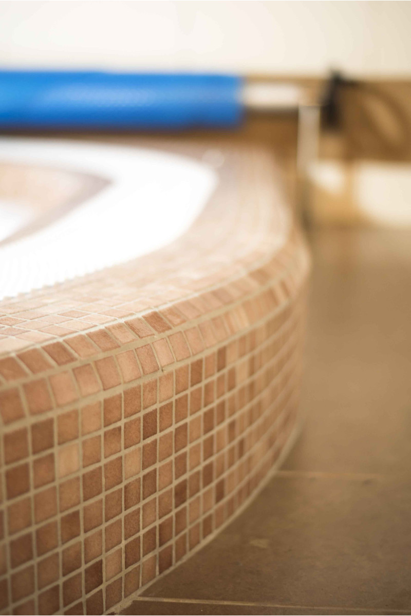- Fliser - indersiden og ydersiden af poolen er beklædt med neutral farvet knust glasmosaik.